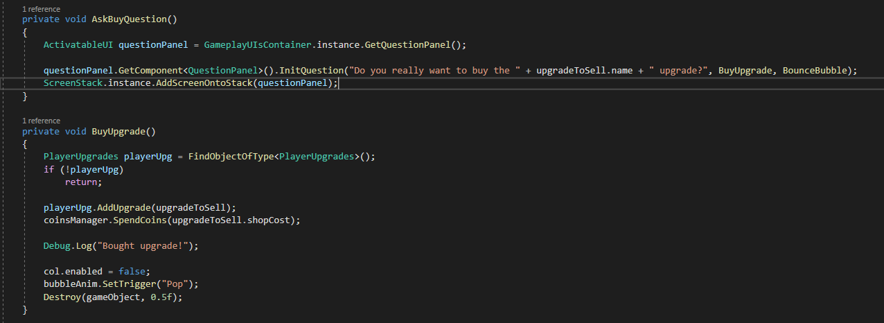 Also, when the player is able to buy the upgrade, using the Screen Stack system, a screen asking the player if they really want to buy the upgrade appears. If "Yes" is the answer, the upgrade is added to the player.