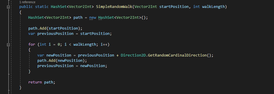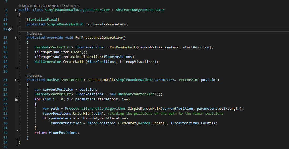 The Drunkward Walk's utility is to create tiled paths, allowing to create dungeons that are walkable by the player or other entities. After filling the stage with floor tiles, the system fills the surrounding areas with wall tiles in order to close the dungeon. Also, in the end of the process, we use the same system of filling the tileset with floors and walls to connect rooms using corridors.