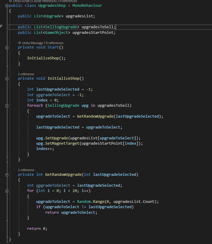 The Upgrade class is the base for all the upgrades created in the game. It inherits from the Scriptable Object class from Unity and contains informations for the upgrades, such as the name, if it does stack or not, the type of the upgrade, etc. Also, the most important thing about this class is the public virtual TriggerEffect function, which is overridden by every upgrade in order to make it's own unique functionality.