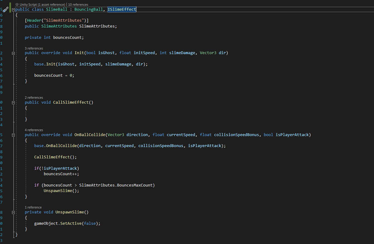 The Slime Effects System is similar to a skill system. Each slime triggers a "skill" when hitting an obstacle or an enemy. The main class of the slimes is the "SlimeBall" class, which inherits from the BouncingBall class, the class containing the physics of the slimes, and the ISlimeEffect, the interface with the method that triggers the effect.