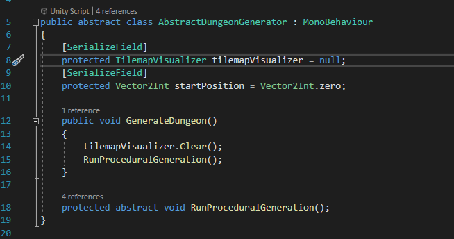 The Procedurally Generated Dungeon system functions based on 3 distincts AI algorithms, each one of them being responsible for different parts of the system. The 3 algorithms are: Random Walk (more specifically the Drunkward Walk), the Binary Space Partitioning and, at last, the Djikstra algorthm.